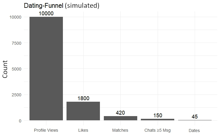 The following plot shows how drastically attention thins out along the typical usage chain. Thousands of profile views lead to a few likes, even fewer matches, and only a tiny fraction turns into real conversations or meetings. The system thrives on the top of the funnel, on clicks, swipes and micro-moments, not on what happens at the end.