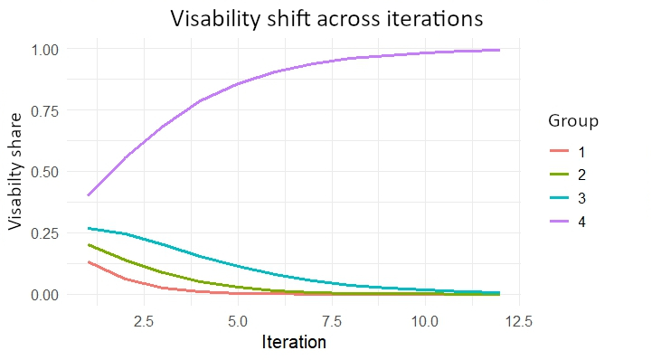 You can simulate this in a simplified but telling way. Imagine four user groups with slightly different reply probabilities. At first all groups are equally visible. As soon as the system weights visibility by past success the balance tilts and small differences become large inequalities. A small initial advantage, such as adherence to an attractiveness norm, skin color, age or gender, can multiply in just a few iterations. The algorithm is not “against” any group, but it amplifies existing social preferences because it learns them as patterns of success.