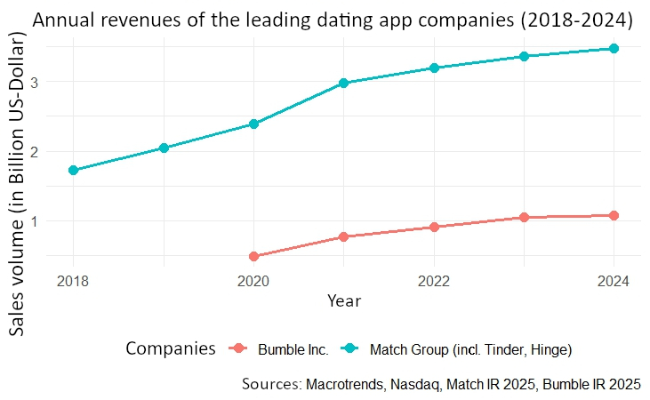The scale is enormous. Match Group, which includes Tinder, Hinge, OkCupid and others, increased annual revenue from about 1.73 billion US dollars in 2018 to about 3.48 billion US dollars in 2024 (Macrotrends, 2025; Match IR, 2025). Bumble Inc., publicly listed since 2021, grew in the same period from 582 million US dollars in 2020 to 1.07 billion US dollars in 2024 (Macrotrends, 2025; Bumble IR, 2025). Both companies show steady growth over years, with a visibly flattening dynamic since 2023, consistent with investor commentary about market saturation and limited user growth. The platforms reach few new users and the number of paying customers stagnates. Investor reports and industry analyses show that companies therefore rely more heavily on price increases, add-on features and algorithmic visibility advantages to drive further growth. Match Group’s 2024 executive commentary explicitly mentions merchandising, à-la-carte features, and price optimization to increase revenue per payer, which supports this interpretation