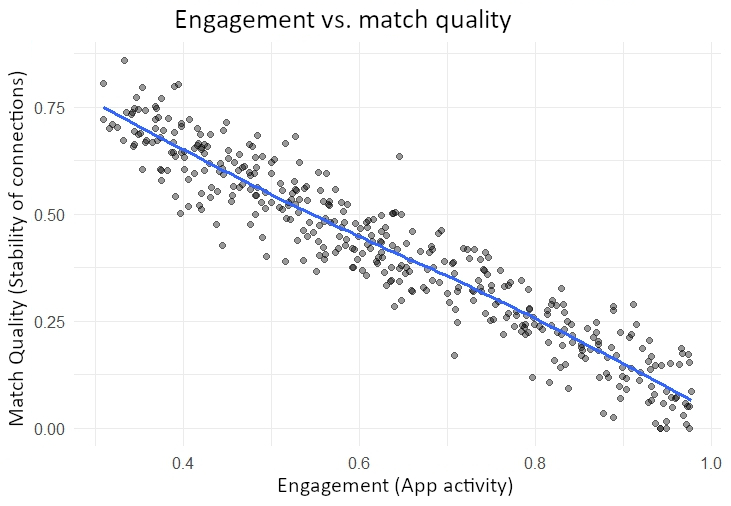 This contradiction can also be shown graphically. If you look at the relationship between engagement, the activity inside the app, and match quality, the depth and stability of connections, a clear pattern emerges. As an algorithm drives more time and interaction, the average depth of connections declines. The following graphic shows this trade-off. Engagement is on the horizontal axis, match quality on the vertical axis. The curve drops visibly. With each increase in activity the system loses some of its ability to foster real closeness. Even a perfect algorithm cannot optimize for short-term stimulation and long-term compatibility at the same time. It has to choose, and in practice it almost always chooses what is measurable, interaction. Clicks can be counted. Feelings cannot.