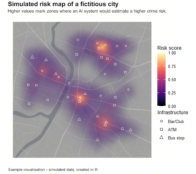 Real systems work in a very similar way, but draw on a much broader range of data. They often include live traffic information, weather data, event schedules, historical crime trends or anonymized mobility flows. Many models update their risk surfaces every few minutes and provide interactive layers that allow officers to filter, zoom in or replay developments over time. My simulated map does not use real data, but visually it closely reflects how risk-based AI predictions look today and why they are so useful for operational planning.