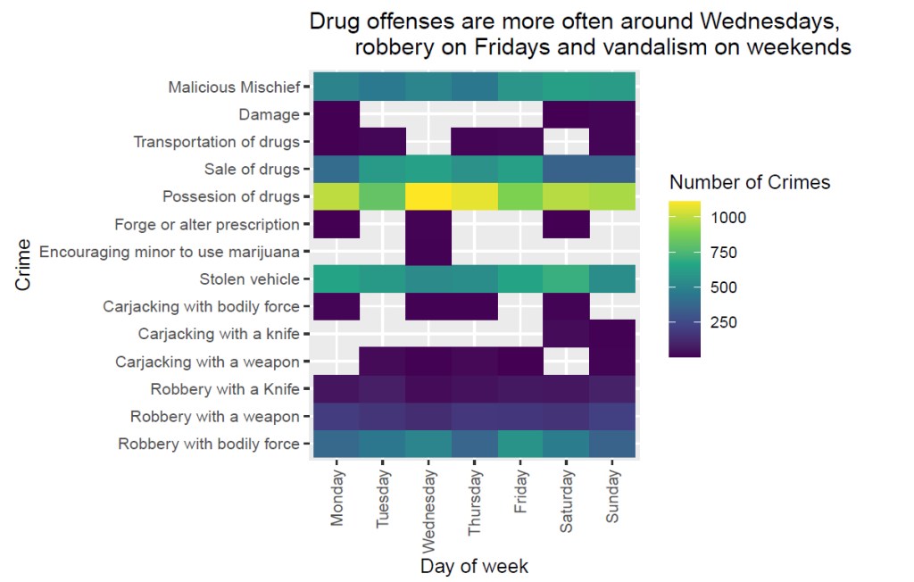 In my San Francisco project, I visualized several of these patterns. They show how crime follows temporal and spatial rhythms. The first graphic shows real data in a weekday heatmap. It reveals that some crimes follow almost a weekly schedule: certain offenses spike on Mondays, others on Friday nights, and still others mirror working hours, commuter flows or nightlife patterns.