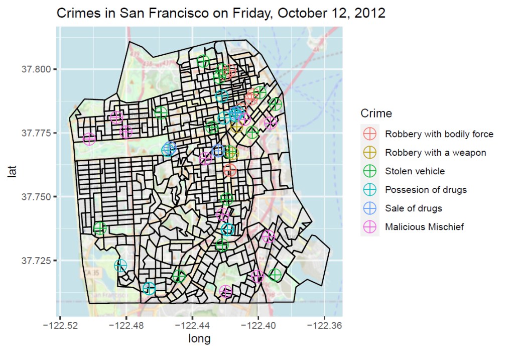 The picture becomes even more striking when looking at a single day. A city map of San Francisco shows how incidents are distributed across neighborhoods and which areas are more affected than others.