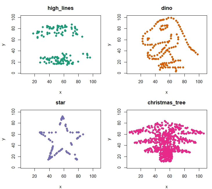 Matejka, J., & Fitzmaurice, G. 2017, May. Same stats, different graphs: generating datasets with varied appearance and identical statistics through simulated annealing. In Proceedings of the 2017 CHI conference on human factors in computing systems (pp. 1290-1294).