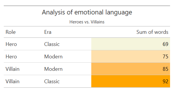 Counting the words identified as emotional in the sentiment analysis reveals that the villains examined speak in a more “emotionally dense” way. Psychologically, this can be explained by a pressure to justify. Good does not need to explain itself, it simply exists. Evil, however, must persuade.