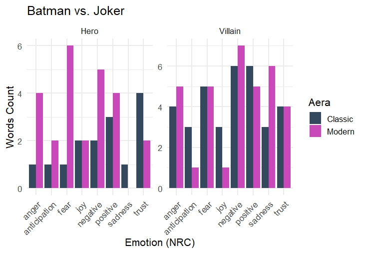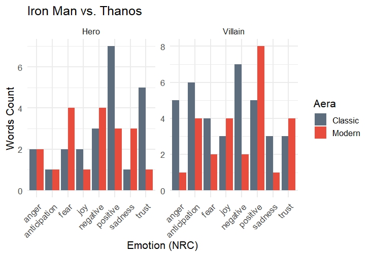 Emotions in texts can be systematically analyzed using so-called sentiment analysis. This method relies on lexicons that allow researchers to extract emotional tones from sentences. Using this approach, selected quotes from central protagonists and antagonists of three major franchises, Marvel, DC, and Star Wars, are examined. The focus lies on Iron Man and Thanos, Batman and the Joker, as well as Luke Skywalker and Senator Palpatine. What all six characters share is that, over decades, different authors have put words into their mouths whose underlying focus has noticeably shifted over time.