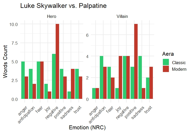 Luke Skywalker and Palpatine are part of the life’s work of George Lucas (classics and prequels), while the modern interpretation of Luke Skywalker was largely shaped by Rian Johnson (The Last Jedi, 2017). Palpatine is the only character whose “modern” quotes chronologically precede his classical version (the prequels), which linguistically reveals his mask as a politician. The linguistic transformation of the modern version of the senator is therefore consistent with other modern antagonists and not simply the result of character development.